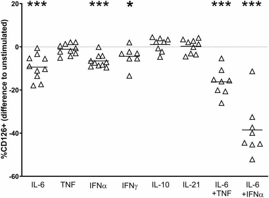 IL-6 + IFNαでリンパ球のCD126(IL-6R)が減少した